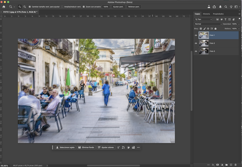 Next, I drag the layers of two images over the third to have all three in one document and align them using: