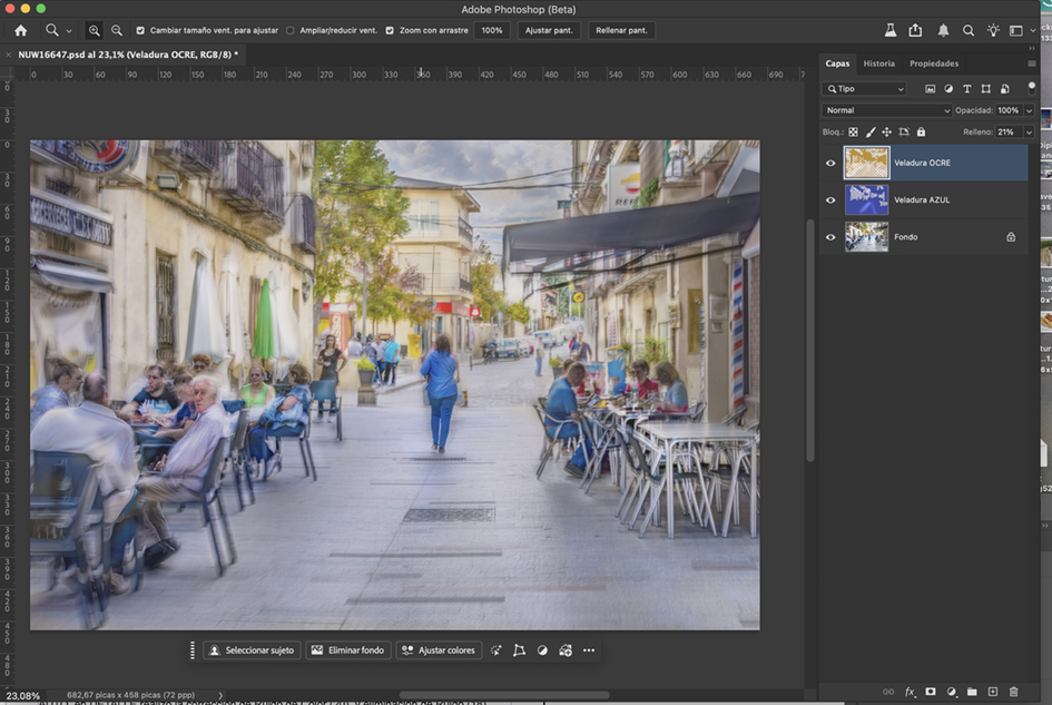 This photograph depicts a typical main street at noon, a time when people are enjoying aperitifs or lunch. It was taken in Buitrago de Lozoya, a town in Spain on the River Lozoya near Madrid, which is known for its well-preserved Moorish walls.