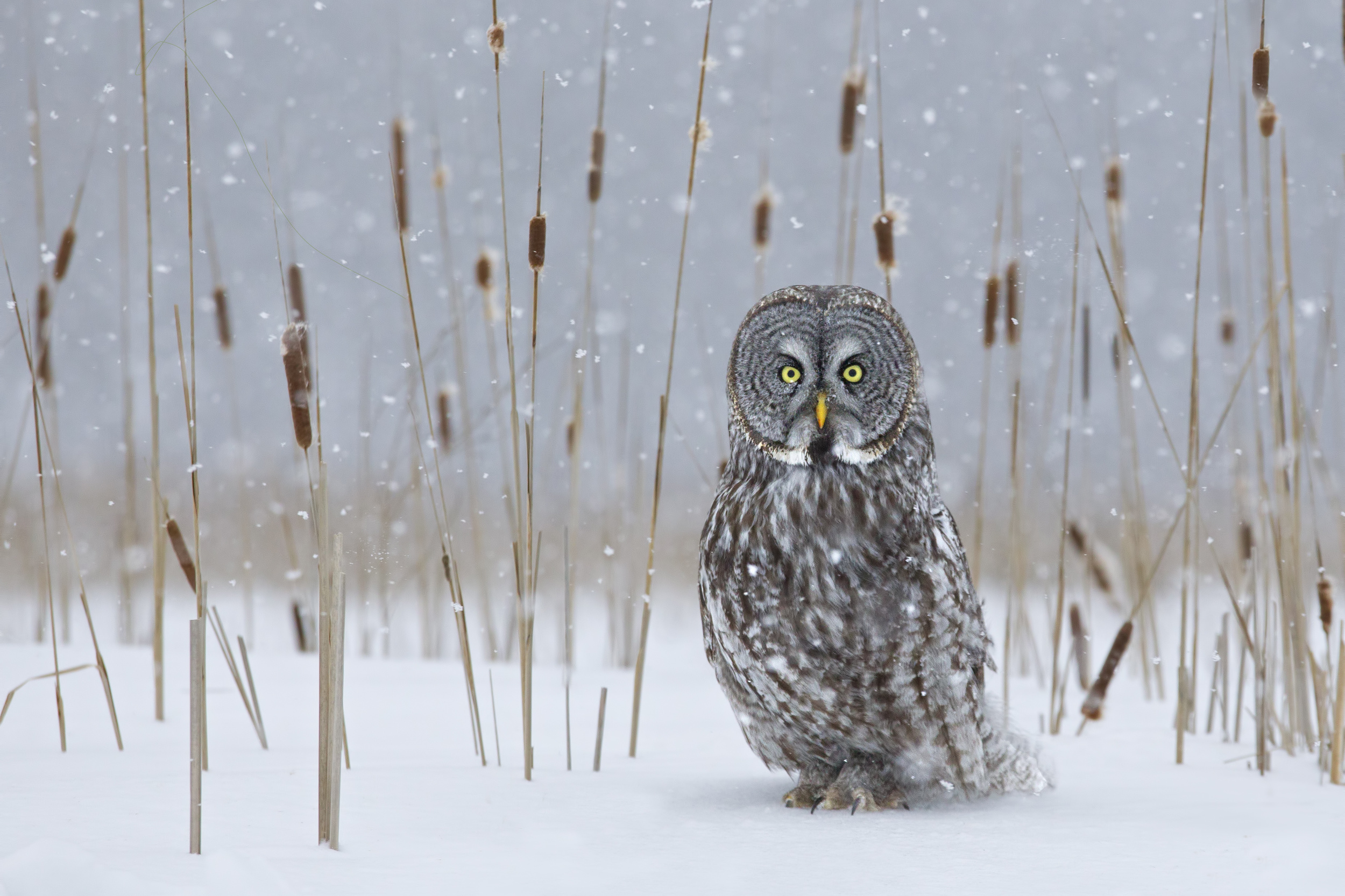 ‘Great Grey Owl in Cat-Tails’ by Rick Dobson